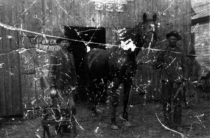 "Blacksmith shops were necessities in the horse era and no one considered it odd for such a place of business to occupy a site just next to the Dudgeon Livery Stable on the southeast corner of the town square. D. N. Gage, the proprietor on the left, guaranteed a professional job of horse shoeing and the animal who has been fitted with two pairs of D. N. Gage footwear reflects the comfort and satisfaction he feels. The owner is not identified nor are the lads who had every boy's sense that informed them when a photographer was about to shoot a scene...