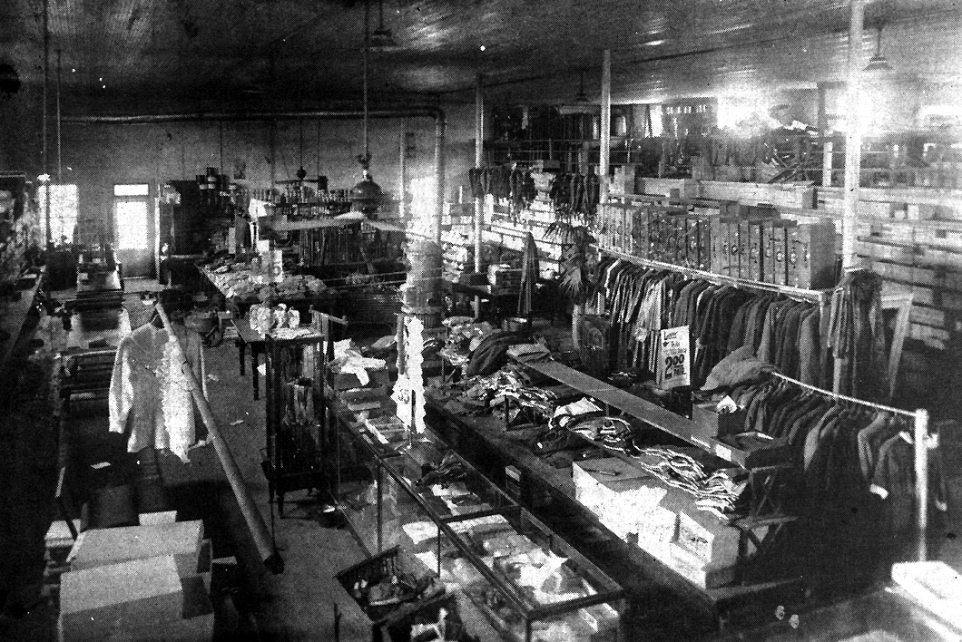 "Gas lights had been used so satisfactorily in the old frame store and the 220 direct current lights then in use were so much dimmer, that the gas system was retained an electricity used only for two ceiling fans in summer.