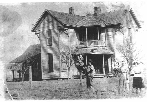 Home of Otis Parks, Datto. It was a hotel at one time, owned by William Wilson. Otis is holding Lyda (1907) on the fence post. Cona is holding Effie (1910) on the wire fencing, and young Mattie (1897) is standing nearby.