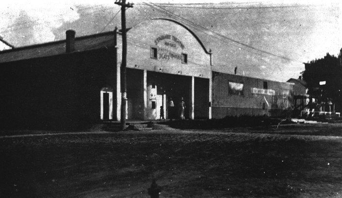 "The Starlight went up in flames following a film explosion in the projection booth one May night in 1919. An hour after explosion all that was left was a heap of crumpled hot tin. The show was returned to First street while a fireproof brick building was rushed to completion. This building now houses the Thomas Brothers Hardware Store. --Picture from the J. M. Oliver Collection.