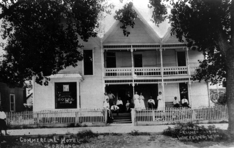 "The fire had started in the Lute West bakery, the one story frame immediately east of the hotel. The two story frame residence at the corner had just been vacated by Till Toalson who had moved to the new Toalson home on Missouri avenue. Fire consumed that building as well as the one story frame across Pine to the south. Lute West family lived there so Lute lost both home and business. The Bank of Corning, across Second street west, was saved by favoring winds. One victim of the holocaust was a Corning character, Old Man Jones, a Civil War veteran with flowing white beard and a collection of unusual watch chains that he wore across his chest. He emerged on the second story balcony over Second street raiment in flames. He was rescued but was so badly burned that he died the next day.