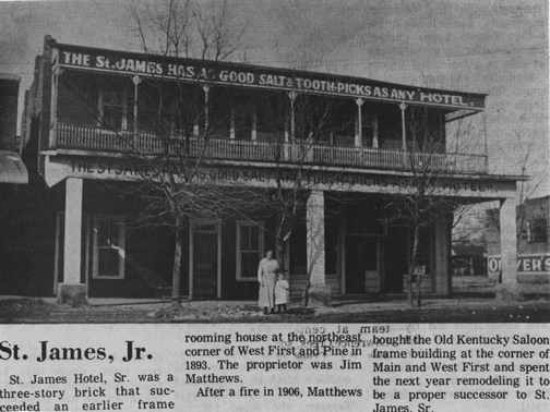 "This view westward down Pine from First street was made in the fall of 1906. Clue to the date is provided by the Methodist church, the white frame building jutting out into Pine at the far end of the street. The Methodists moved their first church building from its site at the corner of Third and Pine in the fall of 1906, clearing the site for a new brick church that was completed in the spring of 1907. The three-story brick in the foreground is The St. James Hotel, James I, owned and operated by the ever resourceful James E. Matthews. Backing the claim for resourcefulness is inn keeper Jim's solution of the slop jar program in a three-story hotel that had no plumbing to provide water. Jim's brilliant solution of the situation was a rear gallery that made waterless water closets, euphemistically called Chic Sales, available to the rooms on every floor from first to third. With the Robinson Livery Stable on the adjoining block next north, Jim had a perfect out in case of squamish roomer complained about obnoxious odors. What could one expect with so many horses outside his bedroom window!!