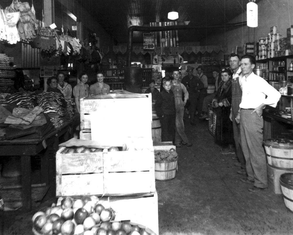 “Thomas Bros. Store late 1930s, 2nd St.”, Corning, AR. “Pauline Dorris, Ester Kersey, Mrs. Everett (Buel) Thomas, Mrs. Roy (Orlena) Thomas, Roy Thomas, Erby Greggory”. Scan from copy. (Marty Fowler).