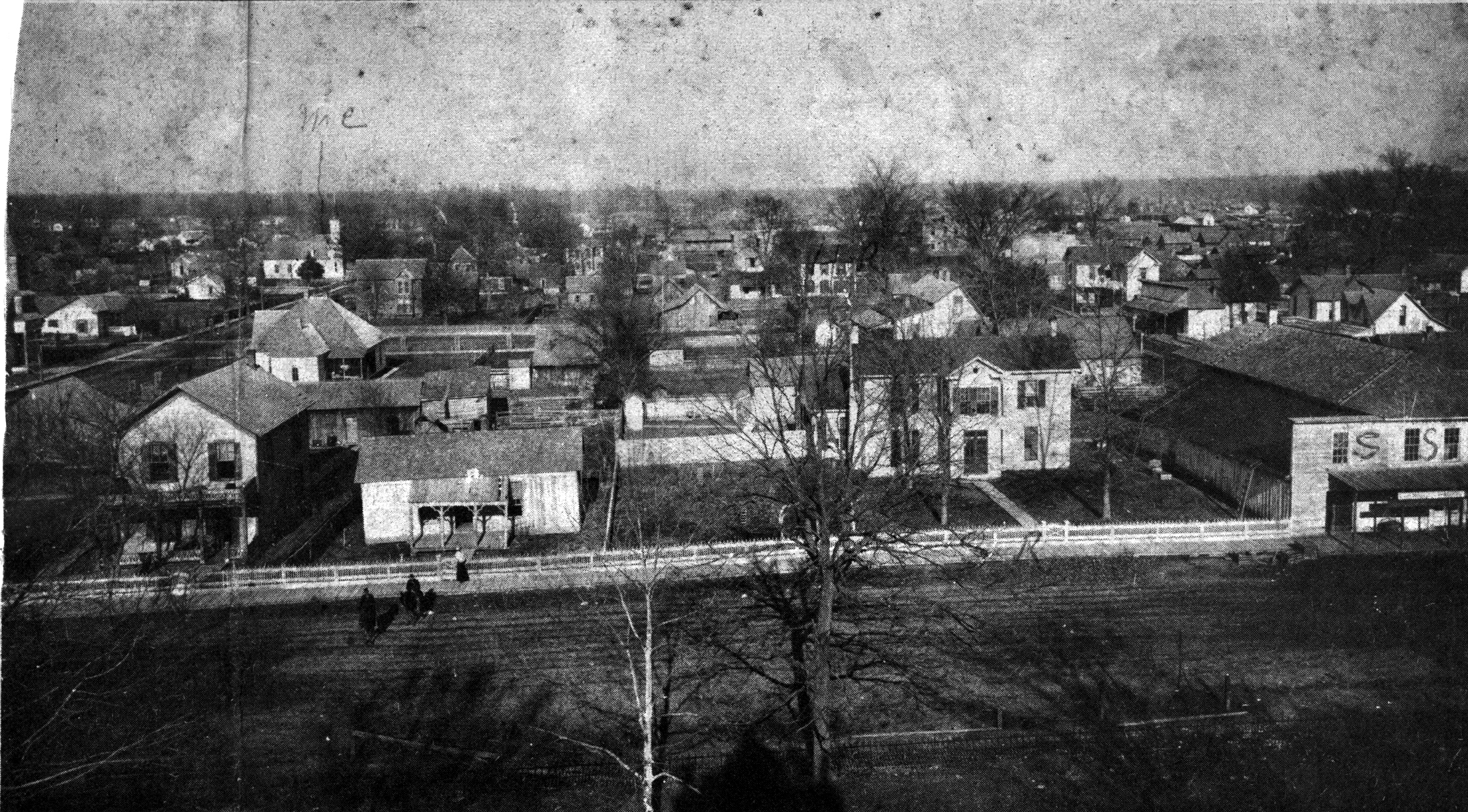 "The above is a reproduction of an old L. D. Oaks picture made from the tower of the Courthouse for a birds-eye [sic] view of Corning. Only a camera can record so detailed a bit of history... the Sheeks-Stephens Store that held down the northeast corner of the square; the E. V. Sheeks and George W. Stephens homes with the law office of E. Foster Brown converted into a residence after he had moved away, in between, on West Third the steeple of the First Baptist Church and beyond it the white frame of Methodist Church. Far up Second Street a reading glass catches the steeple of First Christian Church."