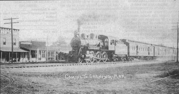 "It was a delight one evening last week to have a friend stop by to show me, then agree to share his latest old-timer picture with all Courier readers. It originally came to a friend in Corning from Marty Fowler, Kennett, Missouri, son of Lucien Fowler and grandson of Martin Fowler, a First Street merchant in Corning for many yaers. Marty acquired a copy of the keepsake picture from the Internet and believes it shows a train as it travels through Corning around 1910. Since that was just shy of 100 years ago, there is no one around that can see well enough or can remember First Street when [sic] it looked like in the picture. The street marker says “West First Street” but we can’t turn it around to see what is on the back side. A call would be appreciated from anyone who knows, or thinks they know, identity of business houses in background. The largest building is thought to be the old Woods and Ainley Store Building, but no one is sure, or it could be the Herbert Good store building. – mv"
