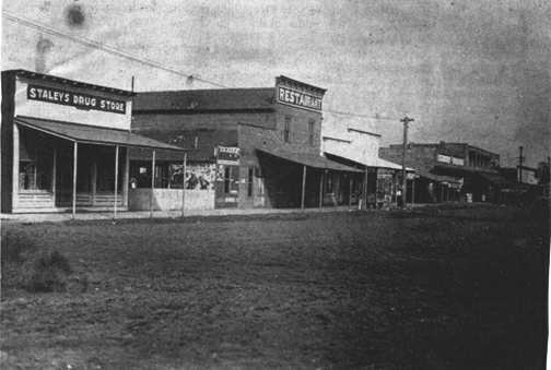"The era is around 1910 and the view is of First Street, from Elm Stree [sic], North. Staley Drug Store has been replaced by The Crystal, Woods occupies the space that was held down by Langdon's restaurant and bowling alley. The sheet iron building to the North is next and the one-story shack that housed Martin Fowler's restaurant is now part of Rorex Store. The Rorex market occupies the brick building to the North and the Midwest Auto Company has replaced the St. James Hotel."