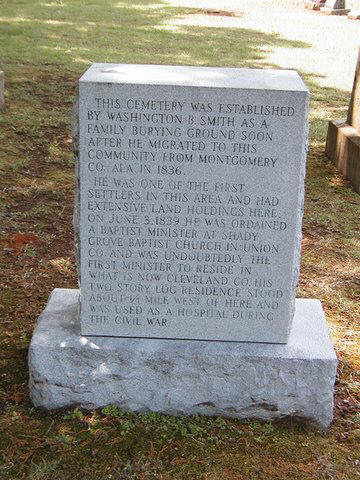 HISTORY: The Cemetery was established by Washington B. Smith as a family burial ground soon after he migrated to this community from Montgomery County, Alabama in 1836. The first grave is that of his mother-in-law, Grandmother Reaves, mother of his first wife Fannie Jane (Reaves). This grave is marked by a tall marble slab with no name or dates and is located in the center back of the cemetery.