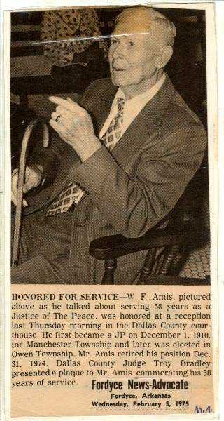 Willie Frank Amis is descendant from a long line of prominent families in the Dallas County area, including the AMIS, KNIGHT & CLIFTON families of Sparkman, Manchester and Owen Townships. Willie service as the Justice of Peace for Dallas County for over 58 years beginning in 1910. Willie was the oldest of nine children born to Paul Franklin & Mary Caroline (Clifton) Amis.