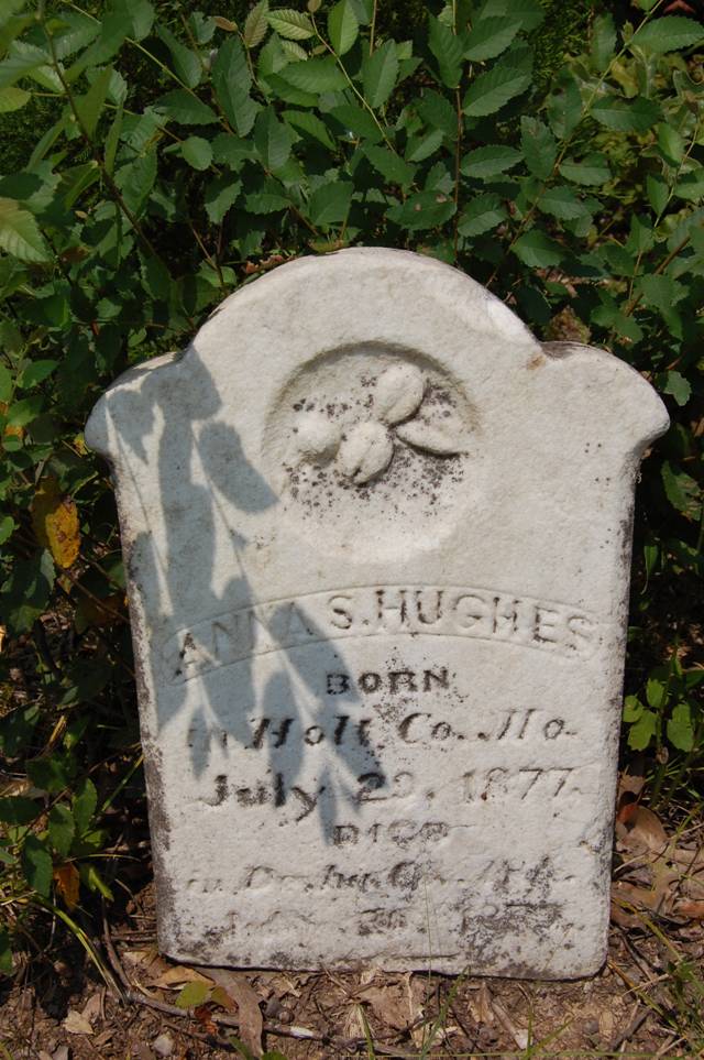 The headstone for Anna S. Hughes, born 1877 in Holt County, MO?; the remainder of the inscription has been lost to time and the elements.
