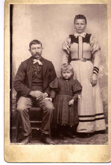 Alvina (Vina) Brehe (1868-1959), taken before 1900, Franklin Co, AR. Daughter of Henry Brehe & Wilhelmina (Eiserman) Brehe. Vina lived with parents in Sub Rosa, then Ft. Smith. Married & divorced Mr. Geiger (no details), always used Brehe surname. Julia (Brehe) Green (1867-1900), husband James Barney Green (1868-1952), & daughter Mina, taken about 1898, Franklin Co, AR. Julia was daughter of Henry Brehe & Wilhelmina (Eiserman) Brehe. Julia born 18 May 1867 Franklin Co, MO, died 7 Feb 1900 Ft. Smith, Sebastian Co, AR, married 24 Mar 1888 in AR James Barney Green; as widower he remarried and moved to OK. Daughter Mina Green born 19 Oct 1894 Charleston, Franklin Co, AR, married 1917 in OK to Anderson Baker Clayton, she died 1977 in OK. Zelda Dubel.