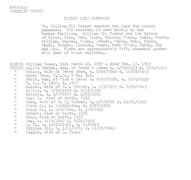 Franklin CountyGenWeb Turner Bend Cemetery William Horner and eighteen members of the Turner family are here.