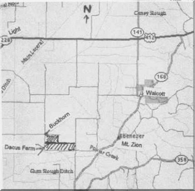 Grandpa lived in Greene County about 65 of his 95 years. In the early years of their marriage, Grandpa and Grandma farmed just west of Light on the Orb Sturkie place. During the 1920s and thereafter, they farmed various places in the Walcott, Buckhorn (southwest of Walcott), and Mt. Zion (Ebenezer) communities. In about 1940, Grandpas brother J. L. Dacus deeded him 160 acres near Buckhorn. He later acquired an adjoining 80 acres to the northwest. He and Grandma gift deeded a portion of the northwest corner of this later acquired property for the site of the Pleasant Valley Baptist Church (Buckhorn), still located there.