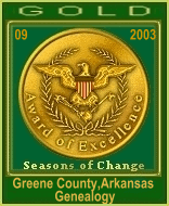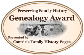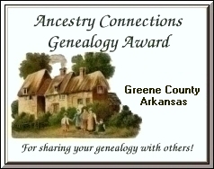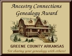 Thank you so much for inviting me to visit your lovely website.... Sure wish I had family in Greene Co., AR... research would be much easier, thanks to your efforts! LOTS of information and so well organized... You have obviously put a lot of time and effort into this website creation and it shows! It's people like you who are willing to go that extra step and share and is what makes the genealogy community so wonderful. Thank you, not only your toil, but also your willingness to share the information with the rest of the world! Please accept this award from Connie's Family History Pages in acknowledgement of a 'job well done'! I will be updating my "Awards Presented' page shortly and will of course add your wonderful site to the listing. Keep up the great work As a side note: The photo used to create this award is from my family album.... It is of the 'soddie' built by my Great and Great Great Grandfathers in Tyron, McPherson Co., NE. Connie Spindel http://tinyurl.com/f1hr |