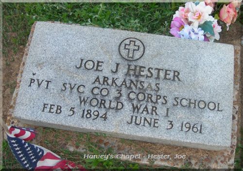 Joe J. Hester Arkansas PVT SVC CO 3 CORPS SCHOOL WORLD WAR 1 FEB 5, 1894 JUNE 3, 1961