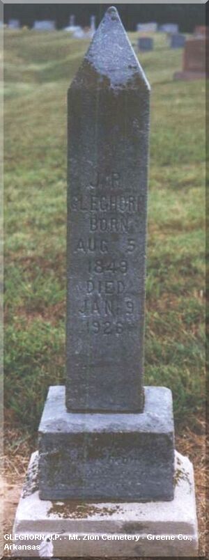 Greene County, Arkansas Mt. Zion Cemetery J. P. GLEGHORN AUG. 05, 1848 - JAN. 09, 1926 **Additional information James K. Polk Gleghorn Husband of Eva Caroline (Freeman) Gleghorn Submitted by Nancy Gruber - grubern@sbcglobal.net