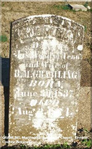 Headstone of Martha Wood Gramling (1837-? ), second wife of Benjamin Martin Gramling. Located in Owen's Chapel Cemetery.