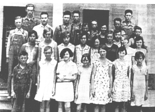 Front from left: Hershel Hurd, Gladys Hopkins , Betty Dorer, Geraldine Richmond,Juanita Brummett, Doyle Songer and Ethel Wilburn, Second Row: Arby Hyde, Ruth Kibler, Lois Benton, Velma Long, Thelma Wilburn, Emma Jean Songer, Albertine McConnaughey, Charlene Hurd, Helen Warren, Back row: Murtis Benton , Fred Rogers, Glen Walker, Robert Brummet, Russel Tabor, Elmer Crafton, Albert Lee Johnson, Ralph Thurmond, Russel Hurd, Lawson Songer, Willard Miller. |