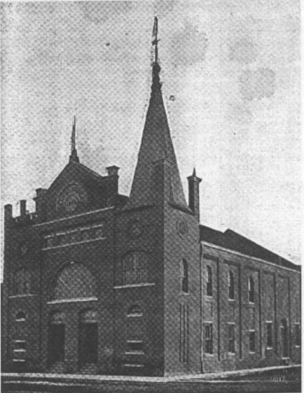 First Baptist Church of Paragould, located on 2nd and Court streets in 1909. The old opera house was purchased and a steeple added to make the church building.
