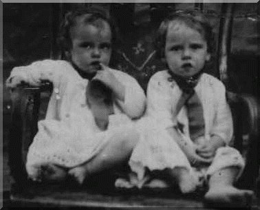 | Twin D/O Samuel David McKinney and Nancy Jane (Bartlett) McKinney Age estimated - about 2 years. Sitting in rocking chair. Mary Marrine McKinney - with finger in mouth, Martha Lorine McKinney Born Jan 27, 1914. Martha died Apr 30, 1987, Mary alive in June,2000. So tiny when were born that they used handkerchiefs for diapers. Donated by Nancy Gruber - grubern@aol.com |