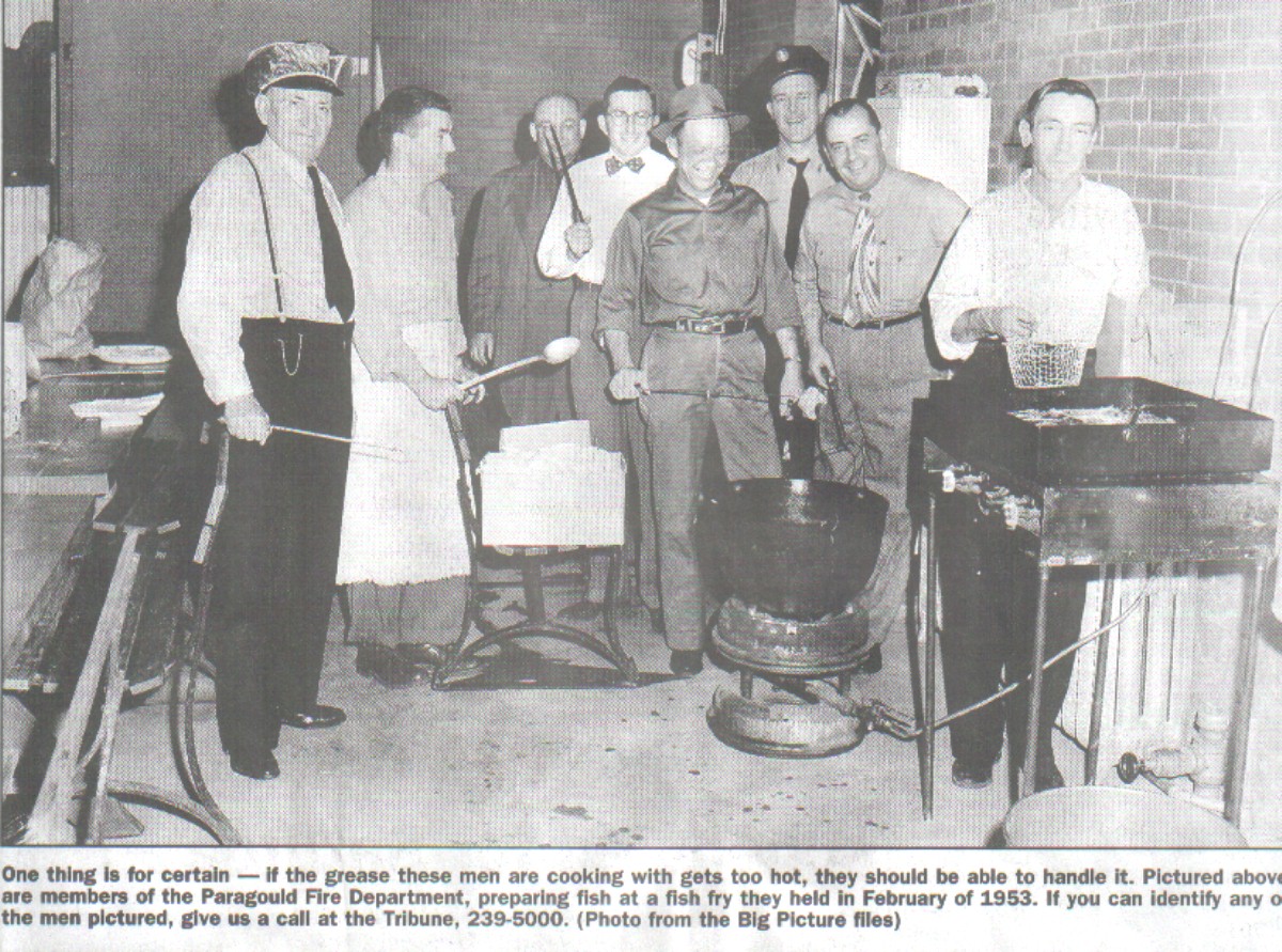 | CAPTION READS: One thing for certain - if the grease these men are cooking with gets too hot, they should be able to handle it. Pictured above are members of the Paragould fire Department, preparing fish at a fish fry they held in February 1953. If you can identify any of the men pictured. give us a call at the Tribune, 239-5000. (Photo from the Big Picture files) |
