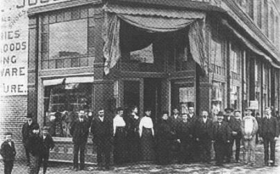 All employees and owner of S.L. Joseph Millinery Co., located on the corner of Pruett and Court streets where Belks's is today. Owner is the fifth man from the right. Photo taken around 1900 but the occassion is not known. Donated by: NorthEast Arkansas Tribune publisher Owen Lusk |