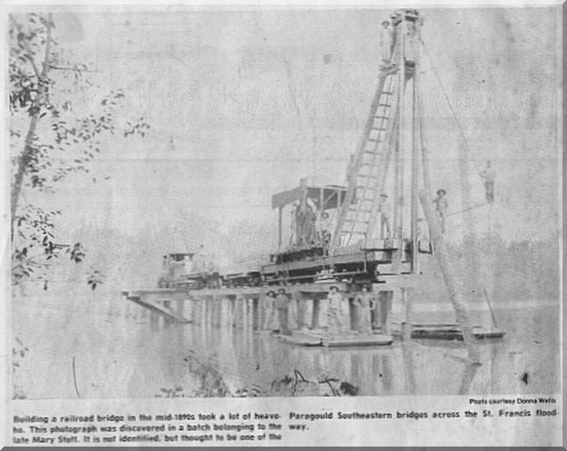 This is also thought to be the PSE's St. Francis River Bridge. It was among the negatives copied by the Big Picture during Paragould's Diamond Jubilee 25 years ago, from pictures belonging to the late Ora Yantis, whose husband worked for the railroad. |