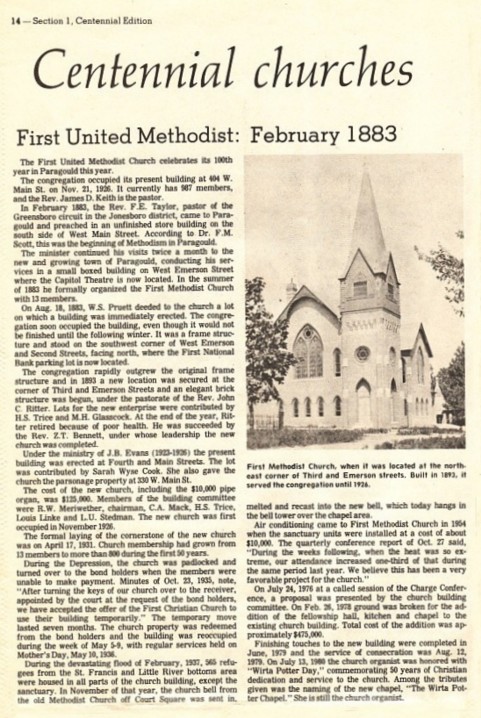 | First United Methodist: February 1883 The First United Methodist Church celebrates its 100th year in Paragould this year. The congregation occupied its present building at 404 W. Main St. on Nov. 21, 1926. It currently has 987 members, and the Rev. James D. Keith is pastor. In February 1883, the Rev. F. E. Taylor, pastor of the Greensboro circuit in the Jonesboro district, came to Paragould and preached in an unfinished store building on the south side of West Main Street. According to Dr. F. M. Scott, this was the beginning of Methodism in Paragould. The minister continued his visits twice a month to the new and growing town of Paragould, conducting his services in a small boxed building on West Emerson Street where the Capitol Theatre is now located. In the summer of 1883 he formally organized the First Methodist Church with 13 members. On Aug. 18, 1883, W. S. Pruett deeded to the church a lot on which a building was immediately erected. The congregation soon occupied the building, even though it would not be finished until the following winter. It was a frame structure and stood on the southwest corner of West Emerson and Second Streets, facing north, where the First National Bank parking lot is now located. The congregation rapidly outgrew the original frame structure and in 1893 a new location was secured at the corner of Third and Emerson Streets and an elegant brick structure was begun, un the pastorate of the Rev. John C. Ritter. Lots for the new enterprise were contributed by H. S. Trice and M. H. Glasscock. At the end of the year, Ritter retired because of poor health. He was succeeded by the Rev. Z. T. Bennett, under who leadership the new church was completed. Under the ministry of J. B. Evans (1923-1926) the present building was erected at Fourth and Main Streets. The lot was contributed by Sarah Wyse Cook. She also gave the church the parsonage property at 330 W. Main St. The cost of the new church, including the $10,000 pipe organ, was $125,000. Members of the building committee were R. W. Meriwether, chairman, C. A. Mack, H. S. Trice, Louis Linke and L. U. Stedman. The new church was first occupied in November 1926. The formal laying of the cornerstone of the new church was on April 17, 1931. Church membership had grown from 13 members to more than 800 during the first 50 years. During the Depression, the church was padlocked and turned over to the bond holders when the members were unable to make payment. Minutes of Oct. 23, 1935, note, "After turning the keys of our church over to the receiver, appointed by the court at the request of the bond holders, we have accepted the offer of the First Christian Church to use their building temporarily." The temporary move lasted seven months. The church property was redeemed from the bond holders and the building was reoccupied during the week of May 5-9, with regular services held on Mother's Day, May 10, 1936. During the devastating flood of February, 1937, 565 refugees from the St. Francis and Little River bottoms area were housed in all parts of the church building, except the sanctuary. In November of that year, the church bell from the old Methodist Church off Court Square was sent in, melted and recast into the new bell, which today hangs in the bell tower over the chapel area. Air conditioning came to First Methodist Church in 1954 when the sanctuary units were installed at a cost of about $10,000. The quarterly conference report of Oct. 27 said, "During the weeks following, when the heat was so extreme, our attendance increased one-third of that during the same period last year. We believe this has been a very favorable project for the church." On July 24, 1976 at a called session of the Charge Conference, a proposal was presented by the church building committee. On Feb. 26, 1978 ground was broken for the addition of the fellowship hall, kitchen and chapel to the existing church building. Total cost of the addition was approximately $475,000. Finishing touches to the new building were completed in June, 1979 and the service on consecration was Aug. 12, 1979. On July 13, 1980 the church organist was honored with "Wirta Potter Day," commemorating 50 years of Christian dedication and service to the church. Among the tributes given was the naming of the new chapel, "The Wirta Potter Chapel." She is still the church organist. |