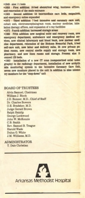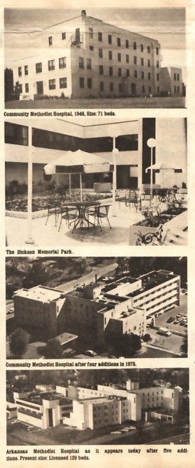 DICKSON MEMORIAL - PARAGOULD'S FIRST HOSPITAL On February 1, 1907, the dream of Dr. Aaron Graham Dickson became a reality with the completion of the Dickson Hospital. Dr. Dickson was an emminent surgeon who began his practice in Paragould in 1890. He studied in Berlin, Vienna, and London and had been urged by colleagues to set up a practice in Memphis. The strong bond which he felt with Paragould and Greene County couldn't be broken, and he remained here for more than 15 years before his vision of a modern hospital was realized. His sister, Letha Dillman, assisted in financing the construction of the hospital, accor- ding to his plans. Dr. Dickson died only two years later in 1909, and to maintain the hospital, his wife found it necessary to incorporate and sell stock. The Dickson Hospital, at its opening, was one of the most modern facilities in Arkansas. It could justifiably boast of electric lighting, hot and cold running water, inside plumbing, steam heating, and a library of over 700 volumes. There was also a pharmacy, large operating rooms, a laboratory, a sterilization room, x-ray facilities, and a school of nursing. The Dickson Memorial Hospital continued to serve this area for 42 years with high standards of care. By the late 1930s, however, the number of physicians had increased, more people were utilizing hospitals as inpatient, and the 20-bed hospital was no longer adequate. When the new Community Methodist Hospital was opened in 1949, Dickson shut its doors and took an honored place in Paragould's history. COMMUNITY METHODIST HOSPITAL Community Methodist Hospital began as a Works Progress Administration (WPA) project in the early 1940's. On November 18, 1940, the Paragould City Council passed a resolution giving Mayor W. C. Middleton power to sign the papers necessary to secure government aid to construct a modern hospital for Paragould. On May 12, 1941, the non-profit Community Hospital Corporation was formed and accepted generous donations from many individuals and firms. Local contributions were between $85,000 and $90,000 and WPA contributions were approximately twice that amount. On June 16, 1941, the Paragould City Council authorized the mayor to sign an agreement between the city and A. N. McAninch, a Little Rock architect, for the proposed municipal hospital. Joseph R. Bertig purchased the land for the hospital in July of that year and donated it to the city as a memorial to his parents. Site development and construction began soon afterward. Due to a shortage of materials during World War II, work was discontinued for four years. At the end of the War, interest was renewed in completing the project and on on March 31, 1947 the Paragould City Council created the Community Hospital com-mission. Houston Garner, Joe Kirchoff, Bill Trice, Joe Wessell, and George Barnhill were appointed as the first commissioners. For two years the members of the Commission worked to restore, refinish, and complete the building and assumed responsibilities for payment of old debts. In August of 1948, the commission submitted application for federal funds under the new "Hill-Burton" law. One third of the total project's cost, including the building and equipment, was provided by a federal subsidy of $80,967.32. Stuck Brothers, Inc. of Jonesboro completed the building for $167,000. In 1949 the Commission began a Memorial Room Fund Drive with a goal of $40,000 in gifts and loans. The community responded and the completion of the hospital was within sight. Prior to the opening of the hospital, the Commission met with various groups in an effort to find one that would provide the hospital with proper leadership. During the early years, the Methodist Hospital at Mem-phis provided Community Methodist with much needed encourage-ment and support. On March 9, 1949, the City Council made the decision to lease the hospital to the locally formed Community Methodist Hospital Association. On the afternoon of October 16, 1949, the 71-bed facility was formally opened, following a dedication service at First Methodist Church. Eugene Lopez, Adminstrator, accepted the licensing certi-ficate and Mayor Ike Wilcockson cut the tape across the double doors at the main entrance. The next day, fourteen patients were transported from Dickson Memorial Hospital and Charles Hill Faulkner, a patient of Dr. Earl McKelvey, became Community Methodist Hospital's first patient. That same day, Dr. Jacob Williams delivered the first baby to be born at the hospital - an eight-pound boy to Mrs. Virgil Rogers of Paragould. |