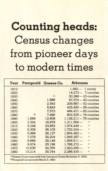 cided with Paragould's early years, there was no town in the county that had more than 1,000 residents.Gaines- ville's population in 1880 has been estimated at less than 300 and it was then the county seat and largest town. that says as much about the times as about the towns. In the 1840 federal census, Greene County's first, the whole county (which then included a good portion of what is now Clay County) included only 1,586 residents. During its first 100 years, the county experienced steady growth. The creation of Clay County in 1873 explains the drop in Greene County's population in the 1880 census. (The procreation of Arkansas coun- ties makes the study of early census figues tricky. Lawrence County, known as the "Mother of Counties" because about 30 other subdivisions were carved from its original area, had an 1820 population of 5,582. Several new counties were created from Lawrence in the intervening years, leaving it with an 1830 popu- lation of 2,806. After Greene and even more counties were carved off, Lawrence had an 1840 population of 2,835.) The population of both Greene County and Paragould continued to rise gradually until the 1920s. Para-gould suffered its first, and so far only, population loss in the 1930 census. In that same census the official county total increased by only 22 persons. Those were the Depression years and the economy was undoubtedly a prime factor in the stagnation. But the hard-times of later years |