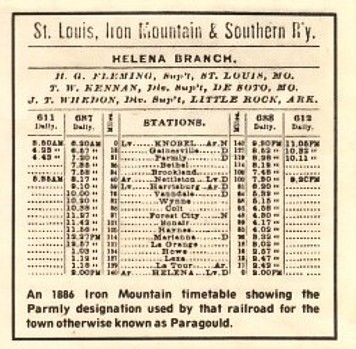 coined the name Paragould." The Missouri Pacific Railroad, successor to Gould's line, tells a slightly different story in its 1957 corporate history, The Empire That Missouri Pacific Serves.: "Rivalry between the officials of the two railroads to name this Arkansas town in honor of their respective 'chiefs' resulted in a compromise and the coined word, 'Paragould,' as its name. "In 1881, the famed Jay Gould was president of the Iron Moun-tain Railroad, now the Missouri Pacific, and Colonel J.W. Para-more was the head of the Cotton Belt Railroad, which crossed the Iron Mountain at this site. The officers of both railroads insisted that the new town bear the name of their head. After heated argu- ments a compromise was reached and the town was christened 'Paragould,' a combination of both presidents' names in 1882. What this section leaves out is Gould's apparent outrage at getting second billing to his nemesis, Para-more. But, really now, would Goulamore have caught on? Still, Gould's railway continued to use its Parmly designation for several years. Just how long is one of the unanswered questions. But the Iron Mountain station here was still listed a Parmly on the 1886 timetable shown on this page. The designation naturally created quite a bit of confusion. There are numerous stories around town of people arriving in Para-gould, seeing the Parmly station sign and thinking that had got off at the wrong train stop. And no one, not even the Miss-ouri Pacific, has been able to ex-plain just who or what the Parmly name came from. (Some Mo-Pac records indicate the name was also spelled "Parmlee," but a railroad spokesman believes the timetable spelling is the correct one.)