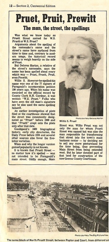 | Pruet, Pruit, Prewitt The man, the street, the spellings Was what we know today as Pruett Street named for W. S. Pruett or W. S. Pruet? Arguments about the spelling of the namesake's name and the street's name have surfaced from time to time and, contrary to modern usage, the historical record seems to weigh heavily on the side of Pruet. But Delores Horton, a relative of the street's namesake, says the name has been spelled about every which way -- Pruet, Pruett, Pruit, even Prewitt. Wills S. However-he-spelled-his name was one of the 77 signers of Paragould's incorporation petition 100 years ago. When his name was recorded on the official record by County Clerk R. H. Gardner, it was written "W. S. Pruet." Folks who have seen the old man's signature say he also used the same spelling himself. An earlier investigation of plats filed at the courthouse showed that the street was consistently designated as "Pruet" before 1900 and that "Pruett" crept onto the plats only after that date. Goodspeed's 1889 biographical history, early city directories, the Daily Press before 1935 and several other sources also favor the five-letter variation. When and why the longer version gained popularity is not known. It is known that Pruett Street --no matter how it's spelled -- was not intended to be Paragould's main street. Oddly enough, Main Street was. Willis Pruet was not only the man for whom Pruett Street was named but was also the man responsible for transforming that street into the town's main business center -- by deciding not to sell any more pasture-land for the time being, thus preventing Main Street from being extended west. But he later donated part of that land for construction of the new Greene County Courthouse. Photo courtesy: Delores Horton |