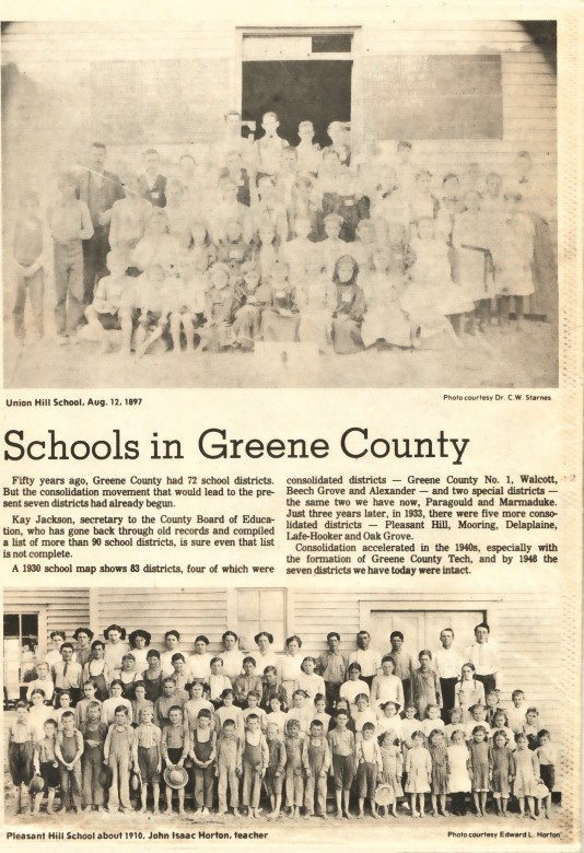 Schools in Greene County Fifty years ago, Greene County had 72 school districts. But the consolidation movement that would lead to the present seven districts had already begun. Kay Jackson, secretary to the County Board of Education, who has gone back through old records and compiled a list of more than 90 school districts, is sure even that list is not complete. A 1930 school map shows 83 districts, four of which were consolidated districts -- Greene County No. 1, Walcott, Beech Grove and Alexander -- and two special districts --the same two we have now, Paragould and Marmaduke. Just three years later, in 1933, there were five more consolidated districts -- Pleasant Hill, Mooring, Delaplaine, Lafe-Hooker and Oak Grove. Consolidation accelerated in the 1940s, especially with the formation of Greene County Tech, and by 1948 the seven districts we have today were intact. |