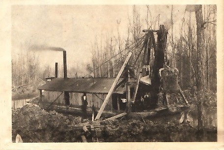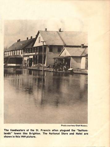 Top Right Photo : The floodwters of the St. Francis often plagued the "bottomlands" towns like Brighton. The National Store and Hotel are shown in this 1909 picture. Photo courtesy: Olah Waters Lower Right Photo: After being used to dig Big Slough ditch, this mammoth dredgeboat was parked to decay. Photo courtesy: Jack Taylor |