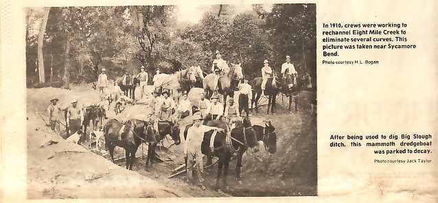 Middle Photo: A crew appears ready to transfer a load of rough cut staves from a dummy line to the waiting boat. Lower Left Photo: In 1910, crews were working to rechannel Eight Mile Creek to eliminate several curves. This picture was taken near Sycamore Bend. Photo courtesy: H. L. Bogan |