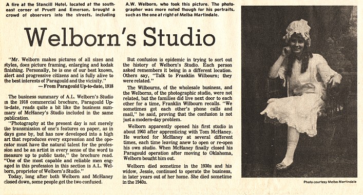 | The business summary of A.L. Welborn's Studio in the 1918 commercial brochure, Paragould Up-to-date, reads quite a bit like the business summary of McHaney's Studio included in the same publication. | the Welborns, of the photographic studio, were not related, but the families did live next door to each other for a time, Franklin Wilbourn recalls. "We sometimes got each other's phone calls and mail," he said, proving that the confusion is not just a modern-day problem. | ||