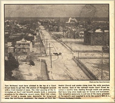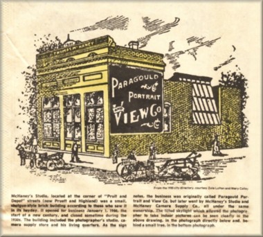 | McHaney's Studio, located at the corner of "Pruitt and Depot" streets (now Pruett and Highland) was a small, shotgun-style brick building according to those who saw it in its hayday. It opened for business January 1, 1900, the start of a new century, and closed sometime during the 1930s. The building included the photographer's studio, camera supply store and his living quarters. As the sign notes, the business was originally called Paragould Portrait and View Co. but later went by McHaney's Studio and McHaney Camera Supply Co., all under the same ownership. The tilted skylight which allowed the photographer to take indoor pictures can be seen clearly in the above drawing. In the photograph directly below and, behind a small tree, in the bottom photograph | Tom McHaney must have climbed to the top of a Court Street home to get this 1906 picture of Paragould covered with a fresh blanket of snow. The rider pausing at the intersection of Court and Seventh streets lends a lonesome presence to the otherwise vacant scene. West Side school, which burned a decade later, dominates the foreground while the courthouse clocktower, the steeple of First Methodist Church and smoke rising from the mills puncture the skyline. East of the railroad tracks Court Street becomes a country lane, leading through woods and pastures that have long since made way for homes and businesses. This delightful panorama is just one of the many glimpses of Paragould's past supplied to us by the camera's lens of J. Thomas McHaney's studio |
