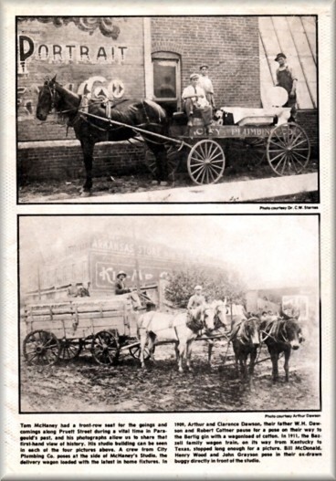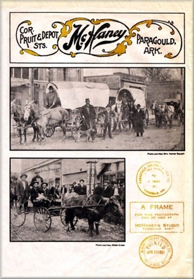 | Tom McHaney had a front-row seat for the goings and comings along Pruett Street during a vital time in Paragould's past, and his photographs allow us to share that first-hand view of history. His studio building can be seen in each of the four pictures above. A crew from City Plumbing Co. poses at the side of McHaney's Studio, the delivery wagon loaded with the latest in home fixtures. | In 1909, Arthur and Clarence Dawson, their father W. H. Dawson and Robert Cottner pause for a pose on their way to the Bertig gin with a wagonload of cotton. In 1911, the Bazzell family wagon train, on its way from Kentucky to Texas, stopped long enough for a picture. Bill McDonald, Henry Wood and John Grayson pose in their ox-drawn buggy directly in front of the studio |