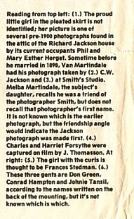 ![]() Reading from top left: (1.) The proud little girl in the pleated skirt is not identified; her picture is one of several pre-1900 photographs found in the attic of the Richard Jackson house by its current occupants Phil and Mary Esther Herget. Sometime before he married in 1898, Van Martindale had his photograph taken by (2.) C.W. Jackson and (3.) at Smith's Studio. Melba Martindale, the subject's daughter, recalls he was a friend of the photographer Smith, but does not recall that photographer's first name. It is not known which is the earlier photograph, but the friendship angle would indicate the Jackson photograph was made first. (4.) Charles and Harriet Forsythe were captured on film by J. Thomasson. At right: (5.) The girl with the curls is thought to be Frances Stedman. (6.) These three gents are Don Green, Conrad Hampton and Johnie Tansil, according to the names written on the back of the mounting, but it's not known which is which. |
