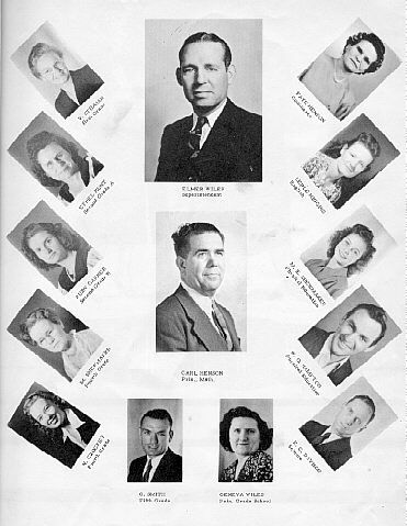 Wiles, Superintendent Center photo: Carl Henson, Principal, Math Clockwise from top right: Faye Henson, Commerce Lerle Higgins, English M. E. Shewmaker, Physical Education W. O. Hampton, Physical Education R. C. Davison, Science Geneva Wiles, Grade School Principal G. Smith, Fifth Grade N. Crocket, Fourth Grade M. Shewmaker, Fourth Grade Ruby Garner, Second Grade "B" Ethel Hunt, Second Grade "A" V. Stidman, First Grade |