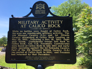“Military Activity at Calico Rock. ![divider]() While no battles were fought at Calico Rock, the area saw considerable military activity. The 4th Missouri Cavalry (C.S.) and 1st Illinois Cavalry skirmished at Calico Rock Landing on May 26, 1861. Following a Nov. 16, 1863, fight near Salem, Confederate troops fell back to Calico Rock. Col. T. R. Freeman’s Confederates were based at Calico Rock in late 1863 and early 1864, operating against the 1st Nebraska Cavalry. Part of the 8th Missouri Militia Cavalry (U.S.) was posted at Calico Rock in 1864, and Freeman had returned by that December.”