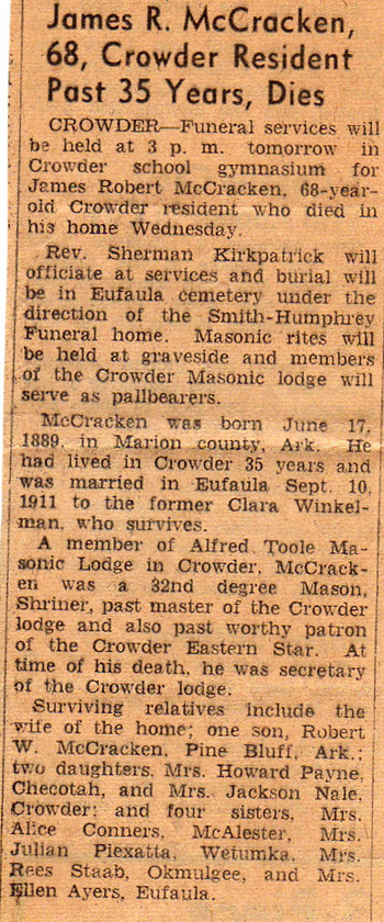 My Mother's Father (my Grandfather) was James Robert McCracken. He was the son of Elam Sulve McCracken, JR. If you will notice, in the Marion County Site, under the Elam G. W. McCracken, you will find that Elam G. W. had a son, Elam Sulve McCracken b. 1835, who had a son which is listed as 'unknown name' or somesuch. Well, I know his name, he was my GreatGrandfather, Elam Sulve McCracken, JUNIOR. (Crowder is in Pittsburg Co, OK & Eufaula is in McIntosh Co, OK.) For text version of this obit click here ![]() Return to Marion Co Home Page
