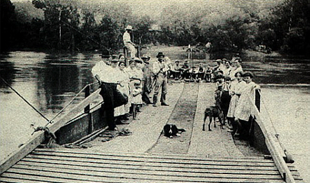 "A typical sunday afternoon at Denton Ferry one of the early crossings on White River above Batesville. It was located about 2 miles above Cotter. First two on left are W N (Newt) and Sarah Christian. Sitting on rack of pilot wheel is Arleigh McCracken, Bert MCracken holding baby who is Lyle Wood. Standing back of Bert is Baxter Hurst who along with E B Wood were owners of the ferry until operation ceased in the early 1930s. Photo made in 1923." This photo is from a xeroxed copy of the book. If you want a better copy contact the Marion Co Genealogy Society which has a copy of the actual book and may be able to produce a better copy.