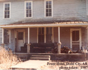 Front view of the Dodd City Hotel, Dodd City, Marion Co AR (This is one of several photos Larry sent. Unfortunantly I lost most of them (along with Larry's email address) when my computer crashed. If anyone knows how to contact Larry please let me know. And, if anyone has additional information about this hotel will you send it along to me? Thanks Linda)