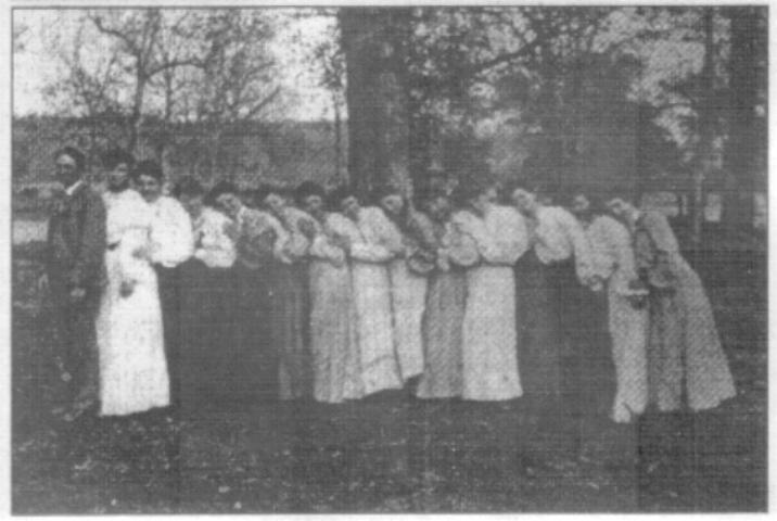 (Will the person who has the original of this photo please contact me? I'd love to have a scan of the original photo. Thanks Linda) "This picture was taken at a May Day Picnic in Yellville in the early 1900s. Pictured are (left to right) Mr. Harris, Hattie Roberts, Vergie Covington, Helen Walden, Willie Layton, Gertrude Thompson, Miss McKay, Reba Dyer, Annie Thompson, Vergie Curtis, Ethel Layton, Miss Robers, Minnie Thompson and Nina Floyd."