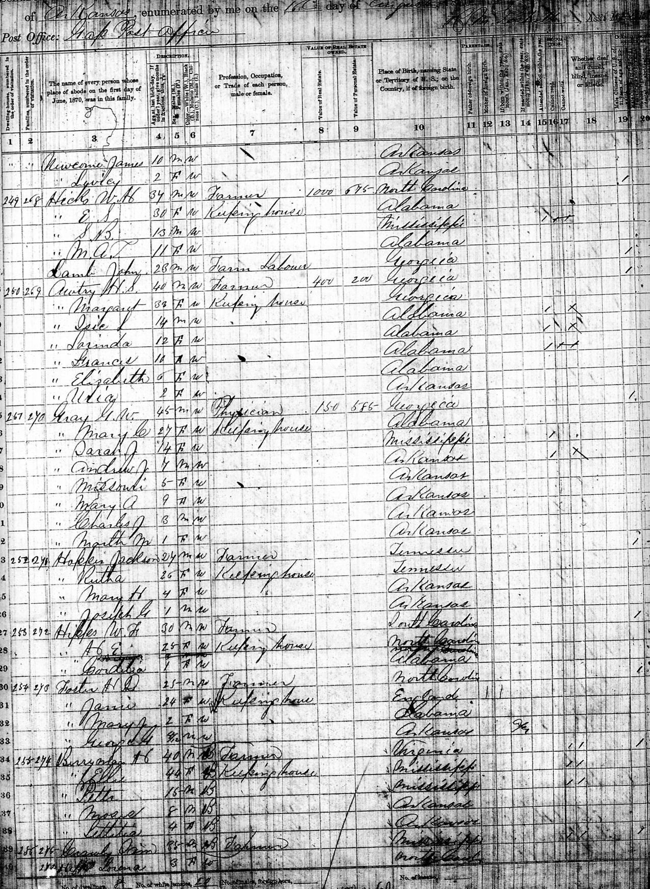 1870 Montgomery County Arkansas Census Gap Township Page 2 Dw 248 Family 267 Newcome , James 10 M W Attended school Arkansas Newcome , Levicy 2 F W Arkansas Dw 249 Family 268 Hicks , W. H. 37 M W Farmer 1000 675 North Carolina Hicks , E. S. 30 F W Keeping House Alabama Hicks , S. B. 13 M W Attended school cannot read or write Mississippi Hicks , M. A. T. 11 F W Alabama Lamb , John 23 M W Farm Laborer Georgia Dw 250 Family 269 Awtry , H. S. 40 M W Farmer (Autrey) 400 200 Georgia Awtry , Margaret 33 F W Keeping House Georgia Awtry , Isic L. 14 M W Attended school cannot write Alabama Awtry , Locinda 12 F W Attended school cannot write Alabama Awtry , Frances 10 F W Attended school cannot read or write Alabama Awtry , Elizabeth 6 F W Alabama Awtry , Uria 2 F W Arkansas Dw 251 Family 270 Gray , G. W. 45 M W Physician (George W ) 150 585 Georgia Gray , Mary C. 27 F W Keeping House (Freeman) Alabama Gray , Sarah J. 14 F W Attended school Mississippi Gray , Andrew J. 7 M W Attended school cannot write Arkansas Gray , Missouri 5 F W Arkansas Gray , Mary A. 9 F W Arkansas Gray , Charles J. 3 M W Arkansas Gray , Marth M. 1 F W Arkansas