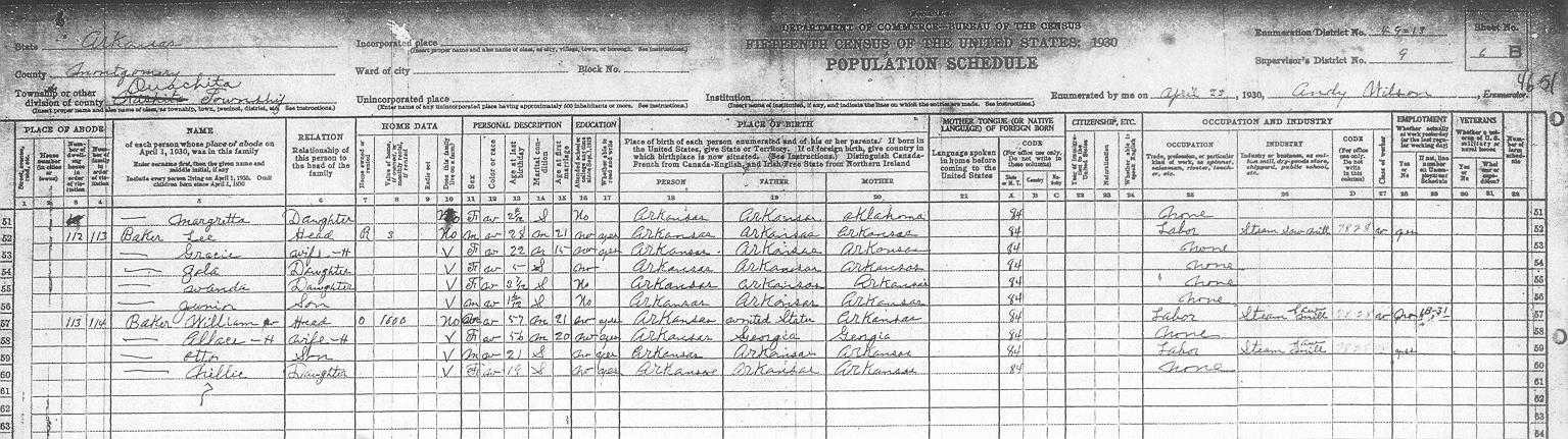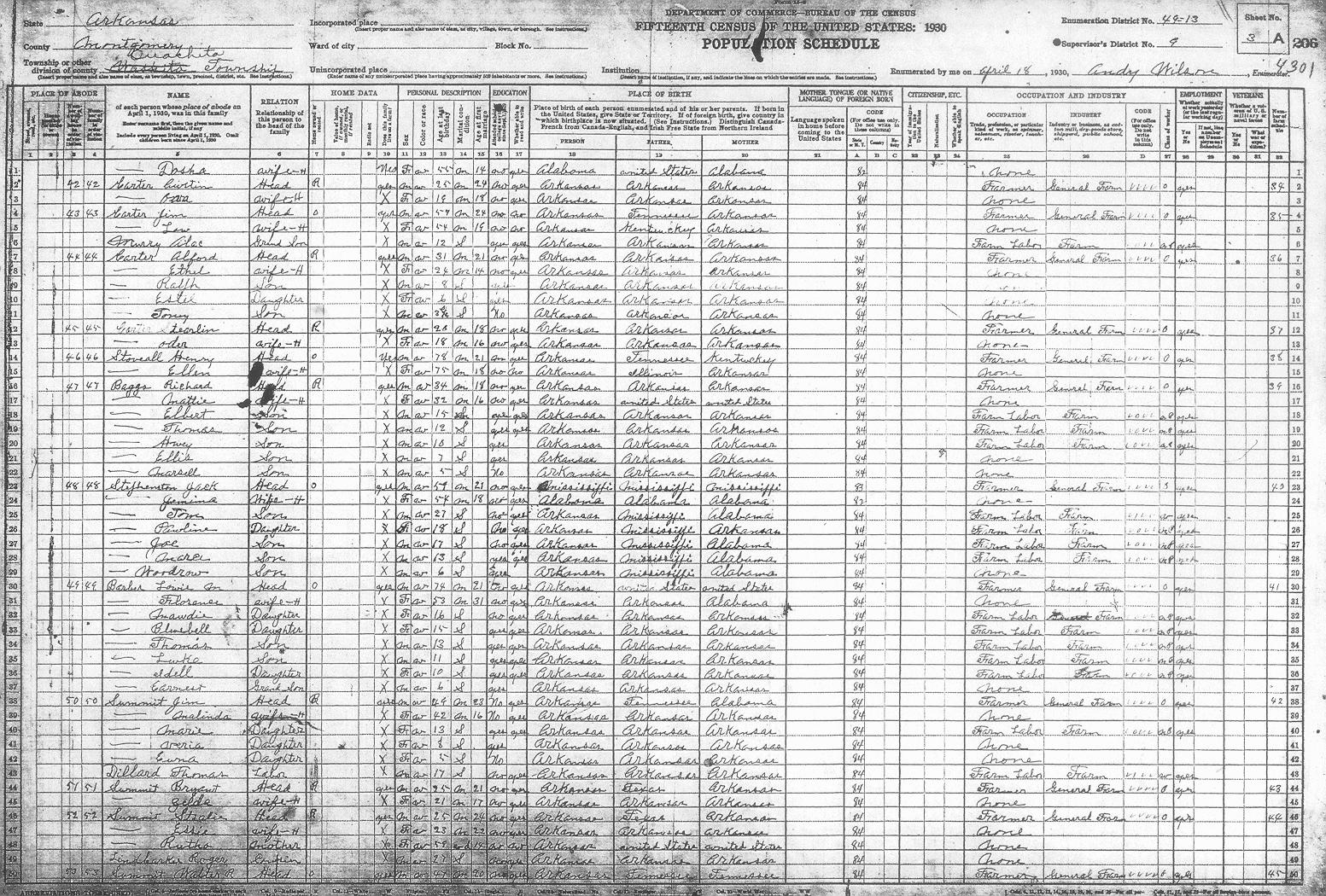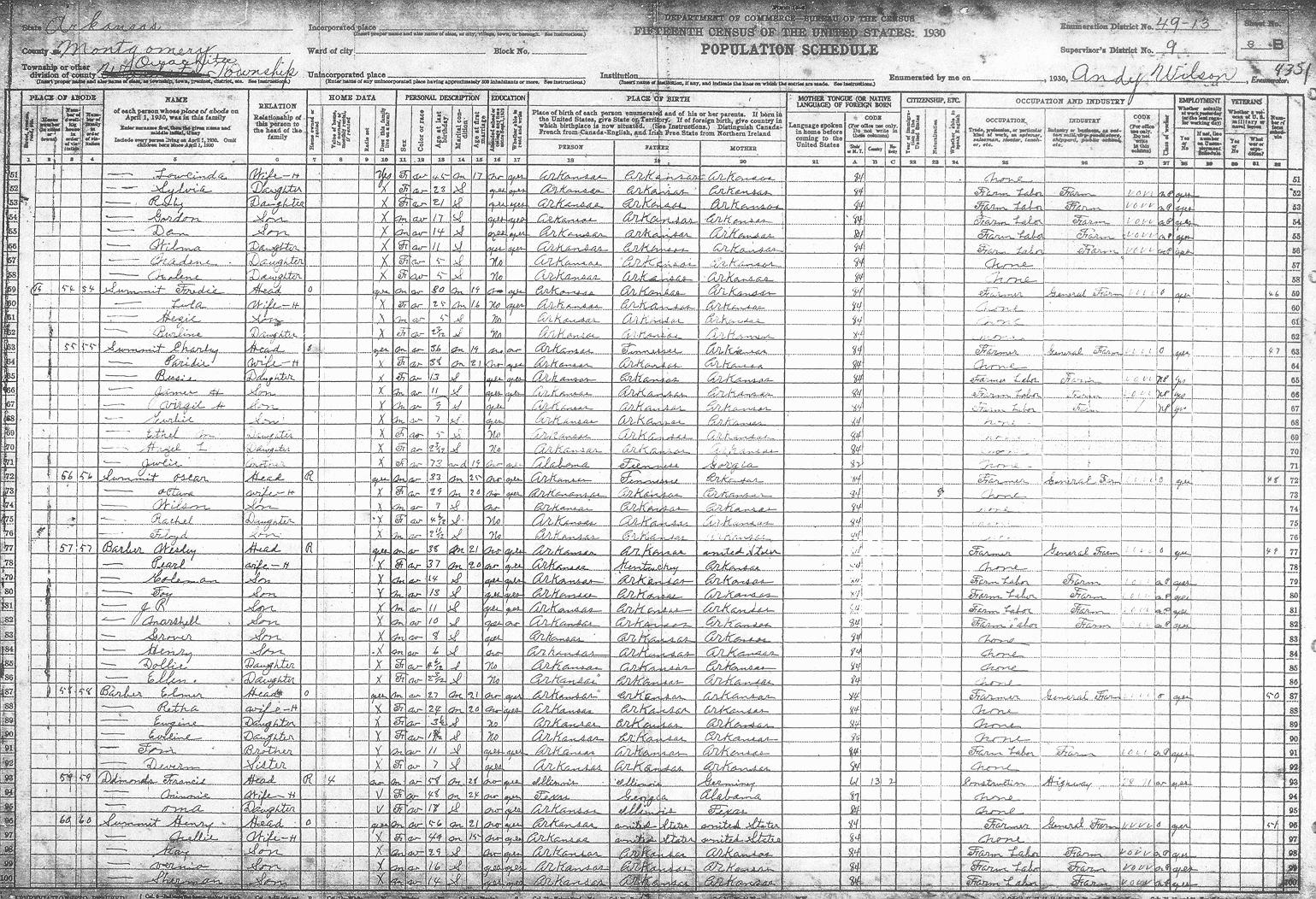 Enumerator - Andy WILSON There are some obvious spelling mistakes. Corrections reflected inside parentheses.Sheet 1A (opens in another window) Rains Preston 1A Plylor David M 1A Braswell Oliver 1A Stovall Cefhae? 1A Plylor Sam 1A Foster Cliford 1A Moody Water 1A Tucker Oscar 1A Elders Tom 1A Case Nettie 1A Summit Frank 1A Summit Jeff 1A Elders Charley 1A Sheet 1B Townsend Arander? 1B Stoveall Coy 1B Summit Ollis 1B Summit Daniel 1B Summit Ervin 1B Waren Ora 1B Elders Joe 1B Carter Delice 1B Caston Dollie 1B Owen Ervin 1B Chambers Lonnie 1B Chambers Ollie 1B Dandey Leonard 1BSheet 2A Barber Jessie 2A Howerton Arley 2A Hatton Charley 2A Qualls Luke 2A Tucker Evert 2A Fulton Jerome 2A Gibbs George 2A Pitman Newit 2A Cumming Jesse 2A Summit Rosey 2A Summit Thomas 2A Barnett Mile? 2A West Chatley 2A West Limmie 2ASheet 2B West Ollis 2B Carter Bill 2B Morrison Robert 2B Whisenhunt Joe 2B Plymale? Andrew 2B McKiney Arigil 2B Tabor Benjamin F 2B Thompson Bettie 2B Summit Isic 2B Carter Riley 2B Hoffer Raborn 2B Staffor Jim 2BSheet 3A Carter Cristin? 3A Carter Jim 3A Murry Alac 3A Carter Alford 3A Carter Stearlin?3A Stoveall Henry 3A Baggs Richard 3A Stephenston Jack 3A Barber Lewis M 3A Summit Jim 3A Dillard Thomas 3A Summit Bryant 3A Summit Steely 3A Lindlarker Roger 3A Summit Walter R 3ASheet 3B Summit Freddie 3B Summit Charley 3B Summit Oscar 3B Barber Wesley 3B Barber Elmer 3B Ddmonds(Edmonds)Francis 3B Summit Henry 3BSheet 4A Tedford Maudie 4A Irons Edna 4A West Lewis R 4A Stoveall Jeff 4A Tedford George 4A Baggs John 4A Edmonds Earl 4A McCullough John 4A Townsend William 4A Baker Oscar 4A Goodmer(Goodner)Ode 4ASheet 4B Summit Earl 4B Crortince Grant 4B Bryant George W 4B Reece Lawla? 4B Hitchcock Walter 4B Rowelwlighter?? Francis 4B Reed Shipman 4B Tabor Odie 4B Carter Berry 4B Summit Barsmith?4B Bass Seborn 4B Muncrief Frank 4B Stoveall Birt 4B Source Citation: Year: 1930; Census Place: Ouachita, Montgomery, Arkansas; Roll: 86; Page: 4B; Enumeration District: 13; Image: 419.0. (no enumeration date given) 76/76 (Last name written over), Francis, Head, Owns home, $300, F, W, 54, Wd, married at age 33, AR/AR/AR REED, Shipman, Father, M, W, 82, Wd, married at age 19, AR/AR/AR, Civil War VeteranSheet 5A Aimeson(Amerson)Robert 5A Emury? Esumit 5A Kelly Thomas 5A Fair James 5A Maddix Jornak 5A Maddox G.W. 5A Laronce Eamma 5A Thompson John 5A Tabor Lee 5A Fair Alace 5A Foster Grace 5A Fair Calvin 5A Gibbs Isom 5ASheet 5B Baggs Mollie 5B Vines A??F.L. 5B Vines Sterling 5B Stoveall Jack 5B West Ross 5B Stoveall William 5B White Mamon 5B Carter Benn L 5B Stevens John 5B Stacky Monroe 5B Sheet 6A Singleton Andy 6A Singleton Curlie 6A Baker James 6A Lee Samgal? 6A Braswell Essie 6A Manley Carra 6A Gray David B 6A Fergueson Raleigh 6A Duniven R.D. 6A Copeland William 6A Dunlap Lonnie 6A McCullough Bill 6A Baker Mack 6A Sheet 6B Baker Lee 6B Baker William W6B