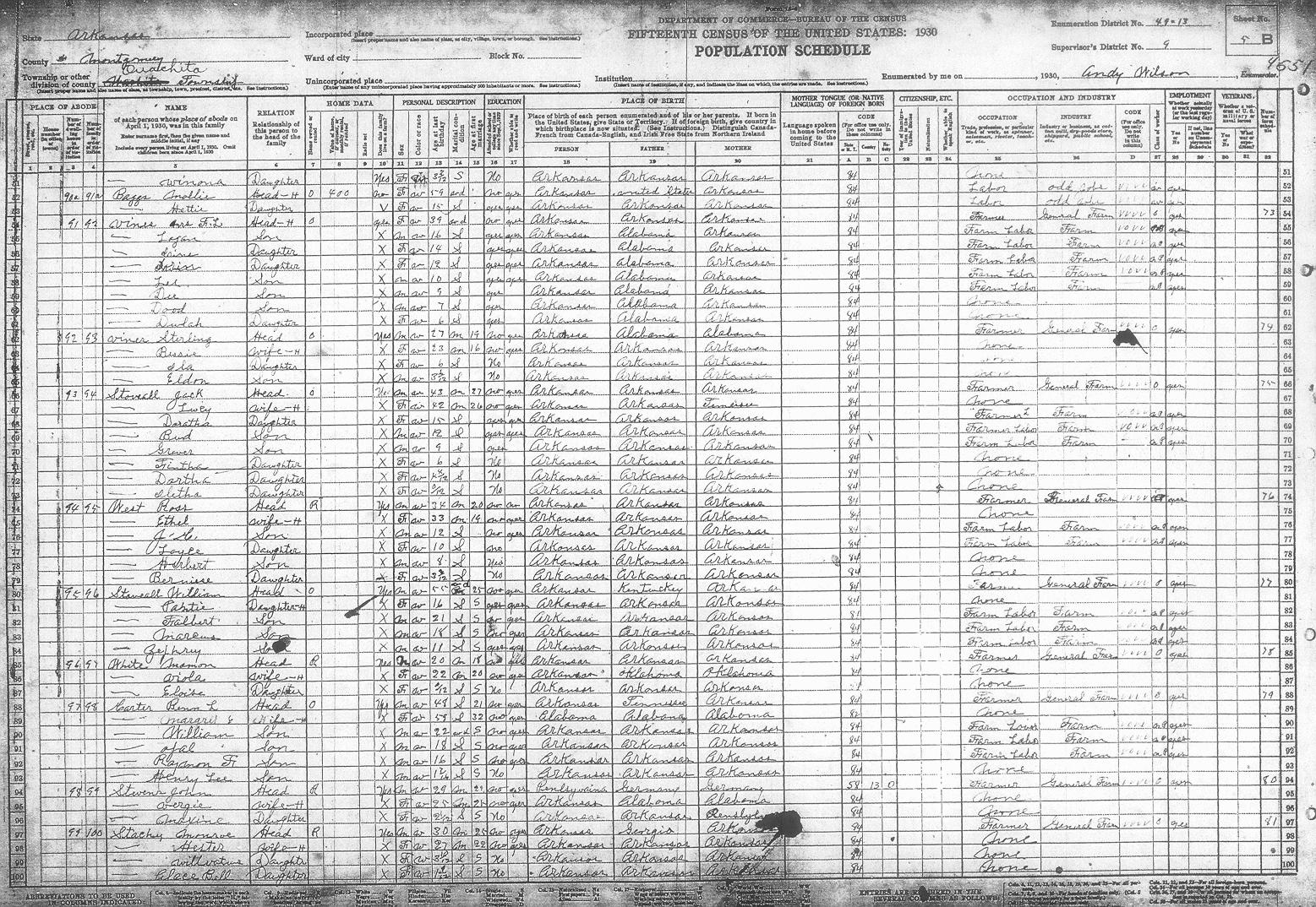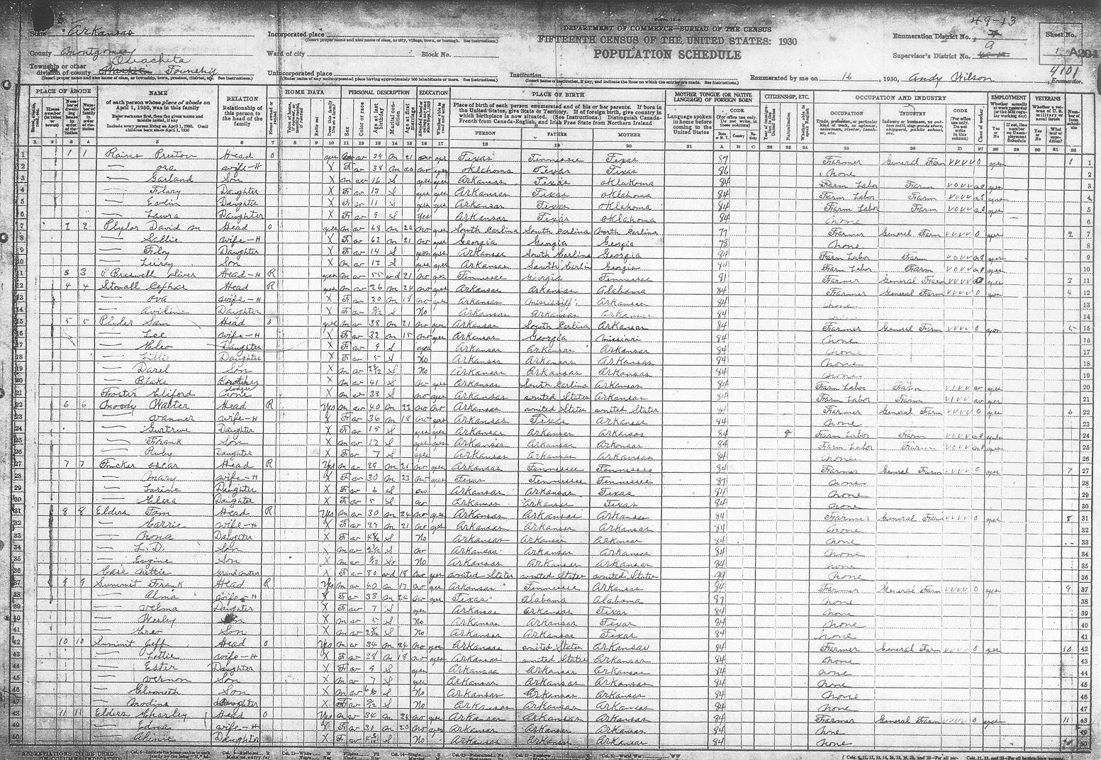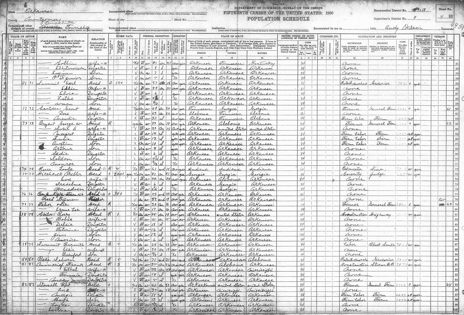 Enumerator - Andy WILSON There are some obvious spelling mistakes. Corrections reflected inside parentheses.Sheet 1A (opens in another window) Rains Preston 1A Plylor David M 1A Braswell Oliver 1A Stovall Cefhae? 1A Plylor Sam 1A Foster Cliford 1A Moody Water 1A Tucker Oscar 1A Elders Tom 1A Case Nettie 1A Summit Frank 1A Summit Jeff 1A Elders Charley 1A Sheet 1B Townsend Arander? 1B Stoveall Coy 1B Summit Ollis 1B Summit Daniel 1B Summit Ervin 1B Waren Ora 1B Elders Joe 1B Carter Delice 1B Caston Dollie 1B Owen Ervin 1B Chambers Lonnie 1B Chambers Ollie 1B Dandey Leonard 1BSheet 2A Barber Jessie 2A Howerton Arley 2A Hatton Charley 2A Qualls Luke 2A Tucker Evert 2A Fulton Jerome 2A Gibbs George 2A Pitman Newit 2A Cumming Jesse 2A Summit Rosey 2A Summit Thomas 2A Barnett Mile? 2A West Chatley 2A West Limmie 2ASheet 2B West Ollis 2B Carter Bill 2B Morrison Robert 2B Whisenhunt Joe 2B Plymale? Andrew 2B McKiney Arigil 2B Tabor Benjamin F 2B Thompson Bettie 2B Summit Isic 2B Carter Riley 2B Hoffer Raborn 2B Staffor Jim 2BSheet 3A Carter Cristin? 3A Carter Jim 3A Murry Alac 3A Carter Alford 3A Carter Stearlin?3A Stoveall Henry 3A Baggs Richard 3A Stephenston Jack 3A Barber Lewis M 3A Summit Jim 3A Dillard Thomas 3A Summit Bryant 3A Summit Steely 3A Lindlarker Roger 3A Summit Walter R 3ASheet 3B Summit Freddie 3B Summit Charley 3B Summit Oscar 3B Barber Wesley 3B Barber Elmer 3B Ddmonds(Edmonds)Francis 3B Summit Henry 3BSheet 4A Tedford Maudie 4A Irons Edna 4A West Lewis R 4A Stoveall Jeff 4A Tedford George 4A Baggs John 4A Edmonds Earl 4A McCullough John 4A Townsend William 4A Baker Oscar 4A Goodmer(Goodner)Ode 4ASheet 4B Summit Earl 4B Crortince Grant 4B Bryant George W 4B Reece Lawla? 4B Hitchcock Walter 4B Rowelwlighter?? Francis 4B Reed Shipman 4B Tabor Odie 4B Carter Berry 4B Summit Barsmith?4B Bass Seborn 4B Muncrief Frank 4B Stoveall Birt 4B Source Citation: Year: 1930; Census Place: Ouachita, Montgomery, Arkansas; Roll: 86; Page: 4B; Enumeration District: 13; Image: 419.0. (no enumeration date given) 76/76 (Last name written over), Francis, Head, Owns home, $300, F, W, 54, Wd, married at age 33, AR/AR/AR REED, Shipman, Father, M, W, 82, Wd, married at age 19, AR/AR/AR, Civil War VeteranSheet 5A Aimeson(Amerson)Robert 5A Emury? Esumit 5A Kelly Thomas 5A Fair James 5A Maddix Jornak 5A Maddox G.W. 5A Laronce Eamma 5A Thompson John 5A Tabor Lee 5A Fair Alace 5A Foster Grace 5A Fair Calvin 5A Gibbs Isom 5ASheet 5B Baggs Mollie 5B Vines A??F.L. 5B Vines Sterling 5B Stoveall Jack 5B West Ross 5B Stoveall William 5B White Mamon 5B Carter Benn L 5B Stevens John 5B Stacky Monroe 5B Sheet 6A Singleton Andy 6A Singleton Curlie 6A Baker James 6A Lee Samgal? 6A Braswell Essie 6A Manley Carra 6A Gray David B 6A Fergueson Raleigh 6A Duniven R.D. 6A Copeland William 6A Dunlap Lonnie 6A McCullough Bill 6A Baker Mack 6A Sheet 6B Baker Lee 6B Baker William W6B