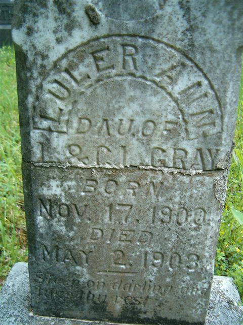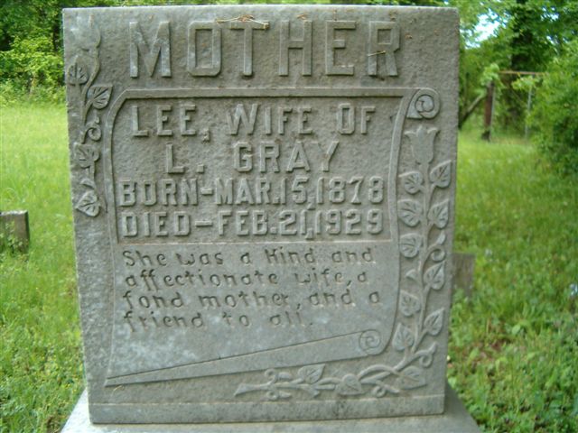 Gray, L. "Lump" 10 Oct 1873 03 May 1958 Gray, Lee 15 Mar 1878 21 Feb 1929 wife of L. Gray Gray, Luler Ann 17 Nov 1900 02 May 1903 dau of L. & C. Gray (stone has been repaired) Irby, Alice M. 29 Jul 1869 14 Jan 1940 Irby, Bessie M. 1891 1916 Mother Lingerfelt, Claudie 1889 1896 Lingerfelt, Joseph 1856 1936 (double stone w/Susie Lingerfelt) Lingerfelt, Susie 1853 1915 (double stone w/Joseph Lingerfelt) Rider, John (broken into 4 pieces) Rider, Mary (broken into 6 pieces) Sam's Leg