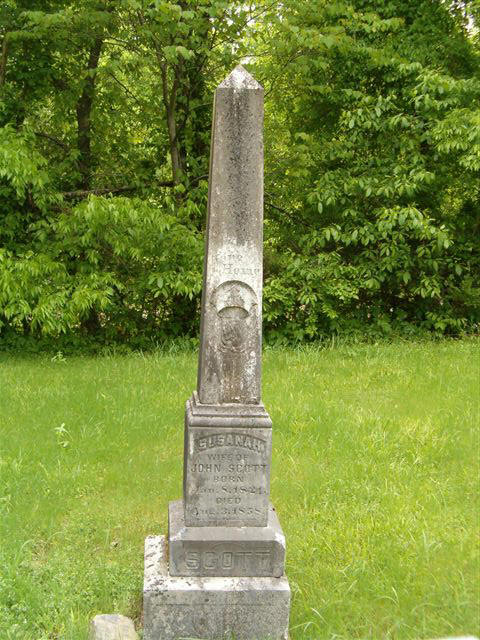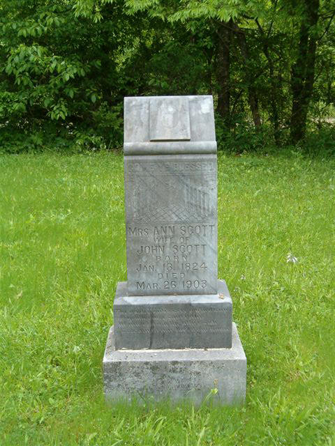 Scott-Wehunt Cemetery is an abandoned cemetery located about eight miles west of Norman on Highway 8. It is located at the junction of Hwy. 8 and North Polk Creek Road (a dirt road) on the south side [the left side]. It is easy to miss as it is located on a curve. The fence around the cemetery is grown up in brush. There is no sign indicating the name of the cemetery. The oldest grave here is Susanah Earp-Scott buried here in 1858. Susanah was the wife of John W. Scott, a member of the 4th Arkansas C.S.A.. John's 2nd marriage was to Susannah's younger sister Anna Earp-Scott 1824-1903. Both wives are buried here.