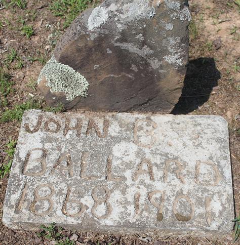 John B. BALLARD (1868 -1901) was b. May 1868 in AR, the son of Nathan Ballard. In 1888 John m. Leona SINGLETON d/o of Joel "Joe" Benjamin SINGLETON and George Ann GILBERT who were m. 01 Nov. 1868 in Montgomery Co. John and Leona had five children including a son, Johnnie Coup BALLARD, b. Sept. 1888 and he was buried in 1900 at Brushy but there is no marker. A daughter Amanda B. born Jan. 1893 m. Jess Vincent. John B. BALLARD d. July 1901 of blood poisoning after he got hurt cutting wood. John B. has a fieldstone for a maker and since 1990s the grave has been marked by a homemade slab of concrete. His name and dates etched in it while the cement was still wet. Leona then m. Edmond D. ROBERSON in 1901. Ed was b. 12 May 1883 in Mexico. Leona SINGLETON had four children by Ed and she died 05 Feb 1913 leaving a seven day old baby, Hewbert. Her children went to live with Mandy Ballard who raised Hewbert. Other children included Noral ROBERSON b. 1904 who m. Viola SINGLETON and Johnnie (a son) b. 1910 and all buried at Brushy. Ed then m. Ada Bullard HENRY and they had four children including Effie Henry Roberson who married Harvry Monroe BALLARD son of John B. and Leona Ballard. Ed and Ada are both buried at Brushy.